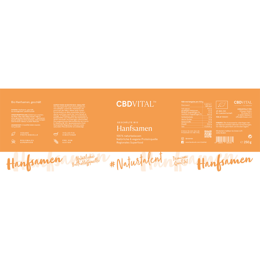 Ob zum Müsli, im Salat, im Smoothie oder einfach als Snack für Zwischendurch: Das heimische „Super Food“ von CBD VITAL zeichnet sich durch eine hohe Konzentration an allen essenziellen Aminosäuren und den sehr hohen Gehalt an Omega-3-Fettsäuren und Ballaststoffen aus. Die von Natur aus hervorragende Nährstoffdichte (B-Vitamine, Zink, Eisen, Magnesium, Kalzium) sowie sekundäre Pflanzenstoffe machen sie zu einem besonders hochwertigen Lebensmittel.
