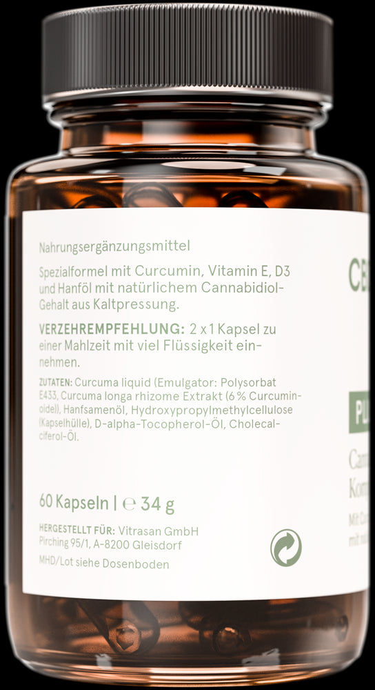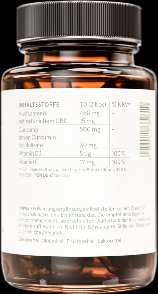 - Spezialformel mit Curcumin, Vitamin E, D3 und Hanföl mit natürlichem CBD-Gehalt aus Kaltpressung.