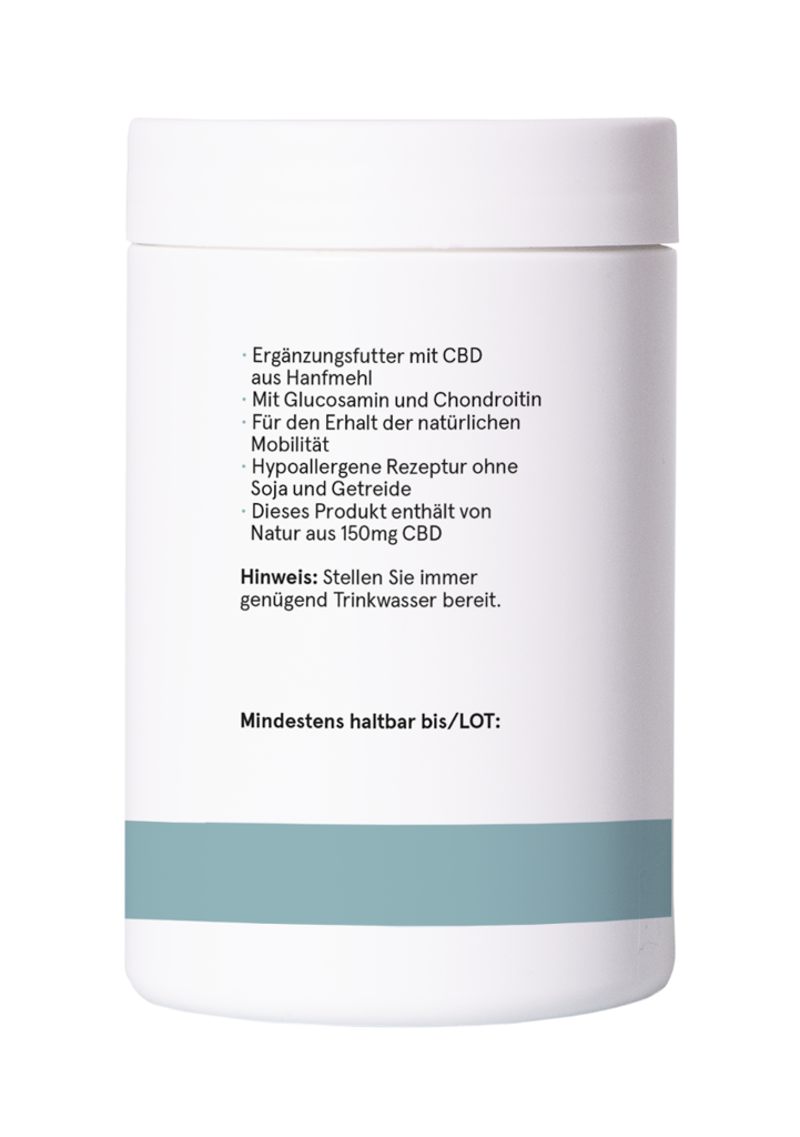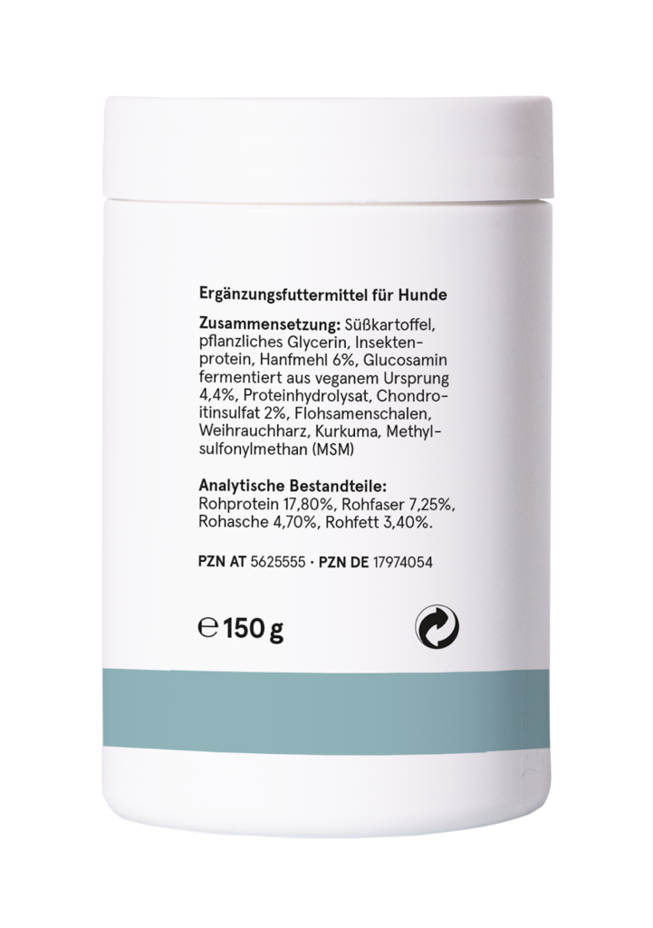 Inhaltsstoffe: Süßkartoffel, pflanzliches Glycerin, Insektenprotein, Hanfmehl 6 %, Glucosamin fermentiert aus veganem Ursprung 4,4%, Proteinhydrolysat, Chondroitinsulfat 2 %, Flohsamenschalen, Weihrauchharz, Kurkuma, Methylsulfonylmethan (MSM)
