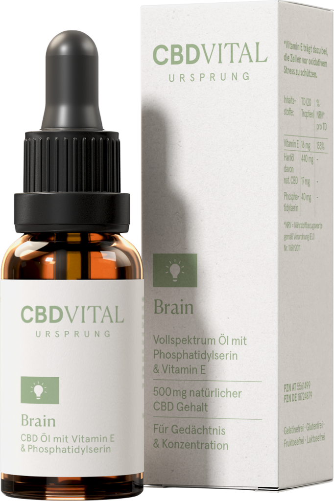 Gedächtnistraining und ein gesunder Lebensstil können helfen, dem natürlichen Verfall der Gedächtnisfunktionen entgegenzuwirken. Aber nicht nur das steigende Alter selbst kann eine Ursache für Vergesslichkeit sein – auch Stress, Erschöpfung und eine hohe Belastung im Privat- oder Berufsleben können die Merk- und Erinnerungsfähigkeit beeinträchtigen. CBD VITAL Ursprung BRAIN ist eine lösungsorientierte Spezialformel zur Unterstützung der geistigen Fitness. Die spezielle Kombination aus Phosphatidylserin, Cannabidiol & Vitamin E unterstützt Ihren Gehirnstoffwechsel nachhaltig. Für mehr Fokus und klare Gedanken.