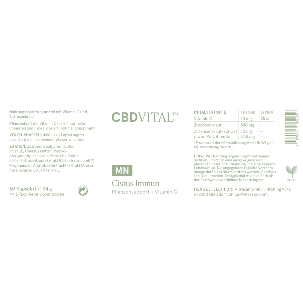Zusammensetzung 1 Kapsel % NRV* Vitamin C 20,0 mg 25 % Zistrosenkraut 380,0 mg - Zistrosenkraut-Extrakt 50 mg - davon Polyphenole 32,5 mg - *NRV = Nährstoffbezugswerte gemäß Verordnung (EU) Nr. 1169/2011.