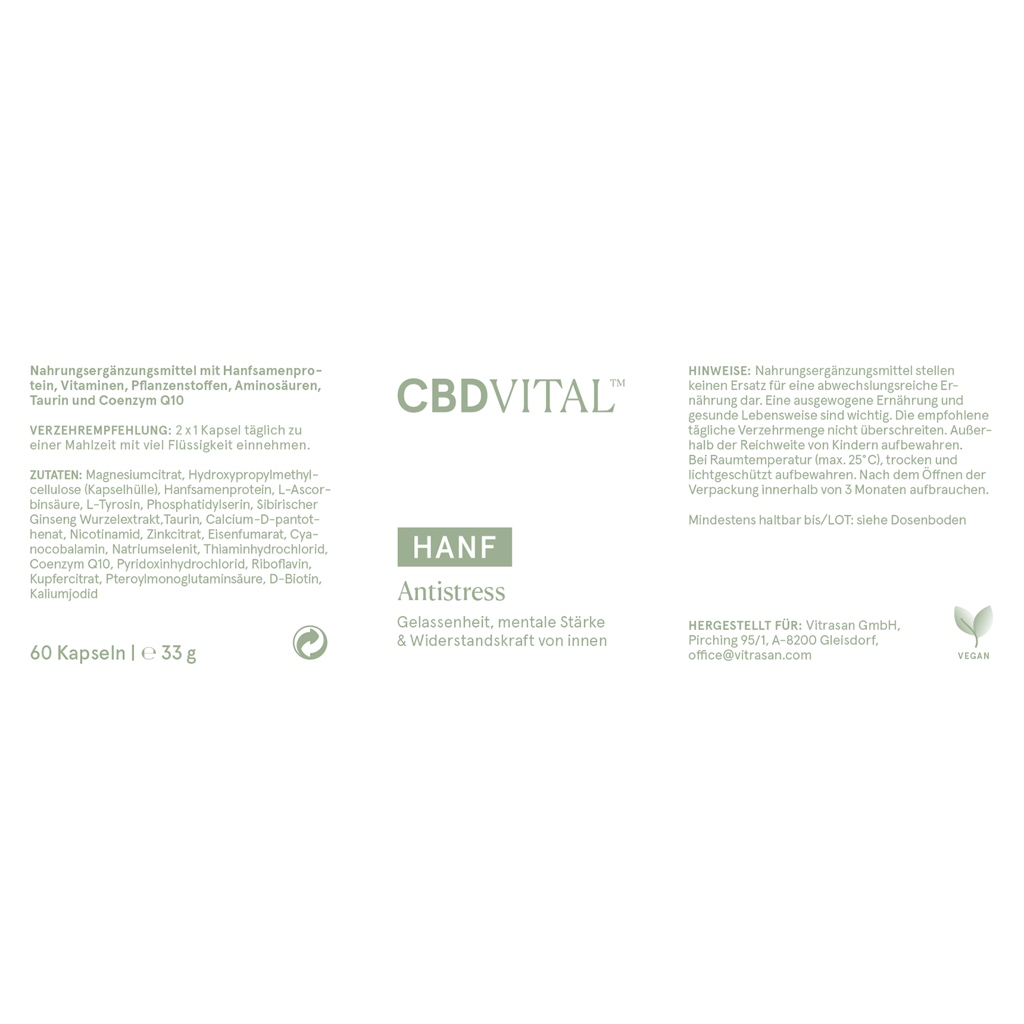 Stress kann auch das Immunsystem schwächen. Die Beigabe des Spurenelementes Zink unterstützt ein normales Immunsystem. Aktivierte B-Vitamine sind optimal bioverfügbar. Phosphatidylserin ist ein Bestandteil von Nervenzellen. Es trägt dazu bei, dass Sie auch unter Stress den notwendigen Durchblick bewahren. CBD VITAL Hanf Antistress liefert einen idealen und einfachen Beitrag, um sich psychisch bzw. mental fitter und motivierter zu fühlen. Zudem hält die Mikronährstoff-Formel die geistige Leistungsfähigkeit hoch. Sie unterstützt die Konzentrationsfähigkeit und die Erholung in anstrengenden Zeiten.
