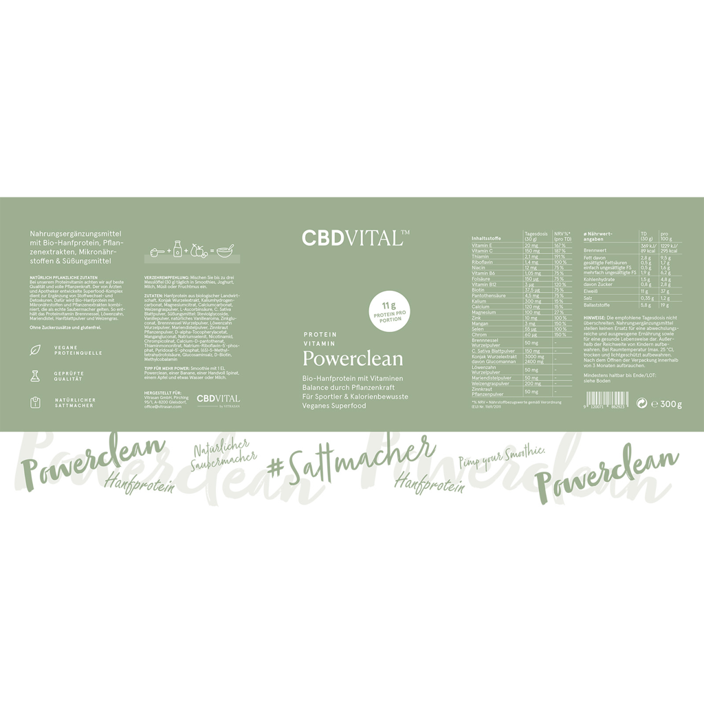 Das CBD VITAL Hanf Powerclean ist eine synergetische Mischung aus natürlichem Bio-Hanfprotein mit natürlichen Pflanzenextrakten und essenziellen Mikronährstoffen.