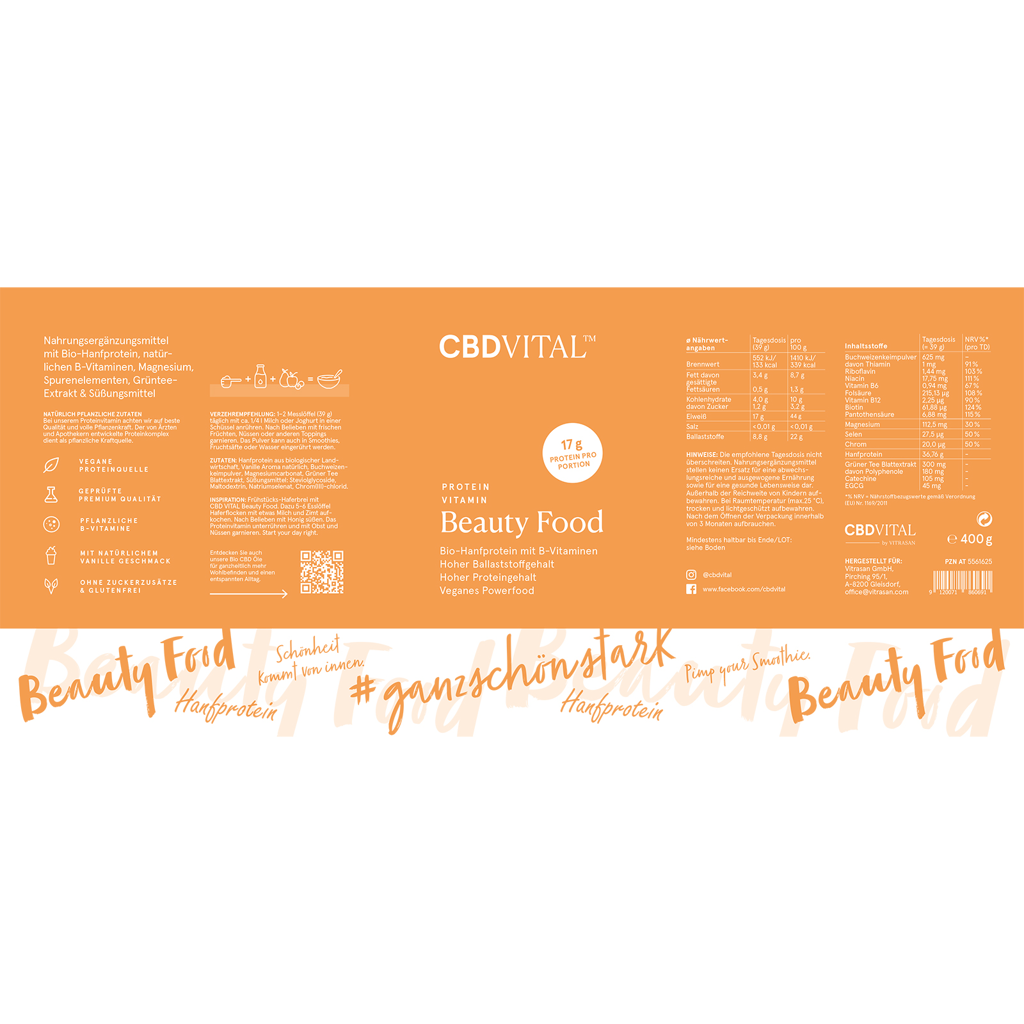 Das Proteinvitamin CBD VITAL Beauty Food liefert gleichermaßen gut verträgliches Eiweiß und essenzielle B-Vitamine, Chrom, Eisen, Selen, Magnesium sowie Grüntee-Extrakt. Auch für eine bessere Verdauung lässt sich das Proteinvitamin einsetzen, denn es ist reich an unverdaulichen Ballaststoffen, die wichtige Nährstoffe für die Darmflora liefern. Die orthomolekularen Mikronährstoffe liegen in einer idealen, synergistischen Zusammensetzung und einzigartigen Komplexität vor. Sie fördern das körperliche Wohlbefinden und steigern die physische und psychische Leistungskraft.
